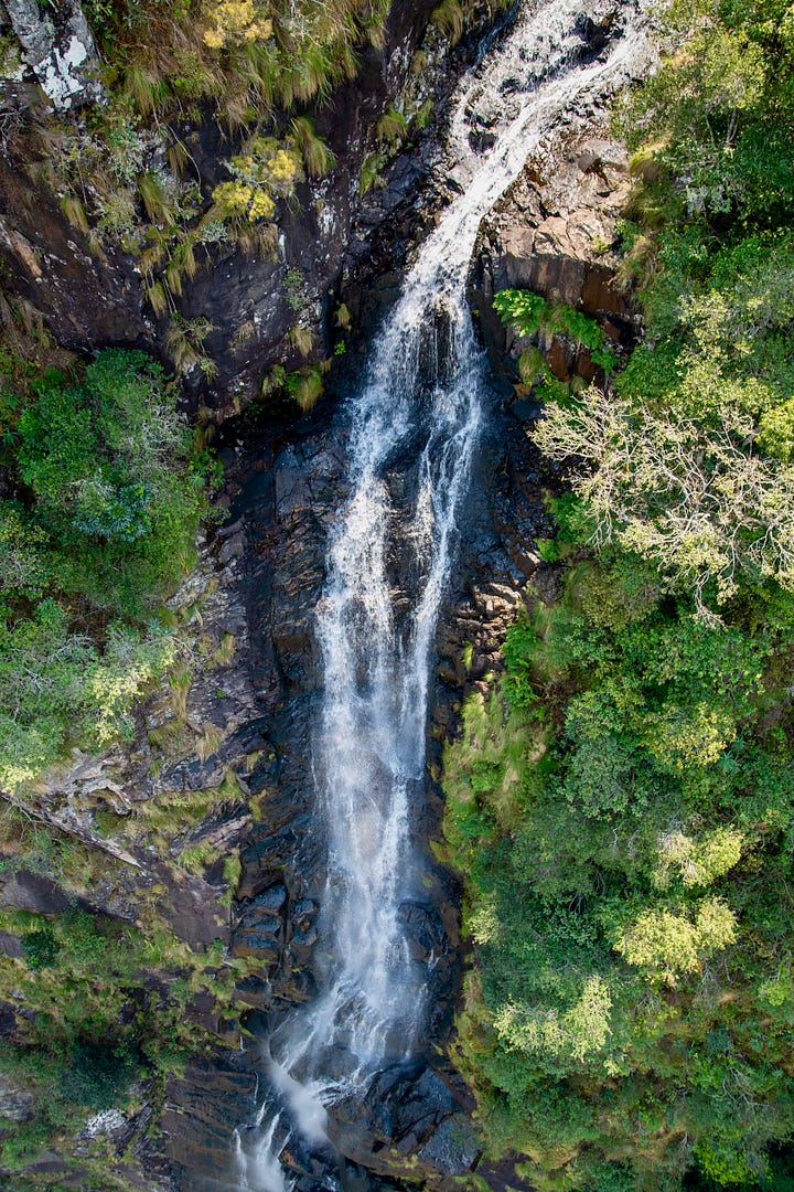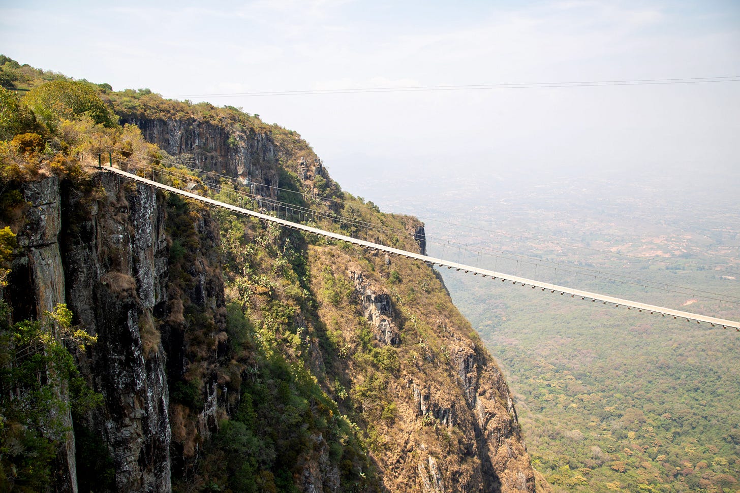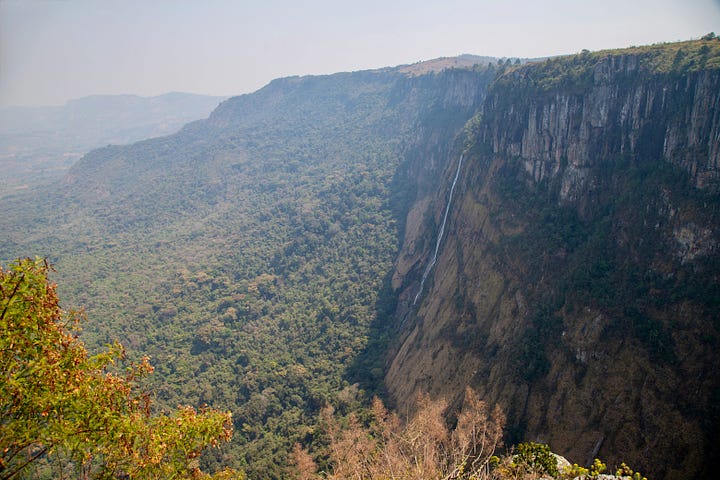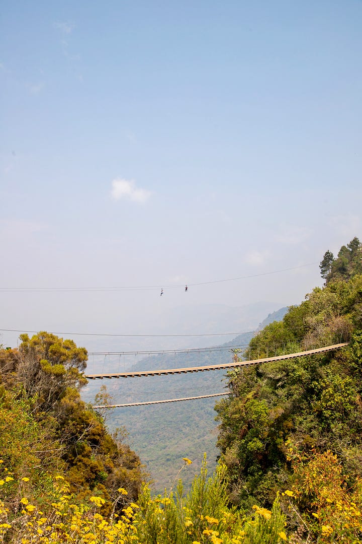 At the headlands, a short path cut through a pocket of forest and tall grasses before depositing me at the skywalk: two suspended bridges stretching out over the 753-meter drop, the zipline extending even farther into space. Unlike Clarkson, I was harnessed in, but stepping onto the cable bridge with or without the harness is still a rush. I looked down at the thin white seam of the falls sliding along the rock face, then out toward the Honde Valley, which unfolded all the way to Mozambique.